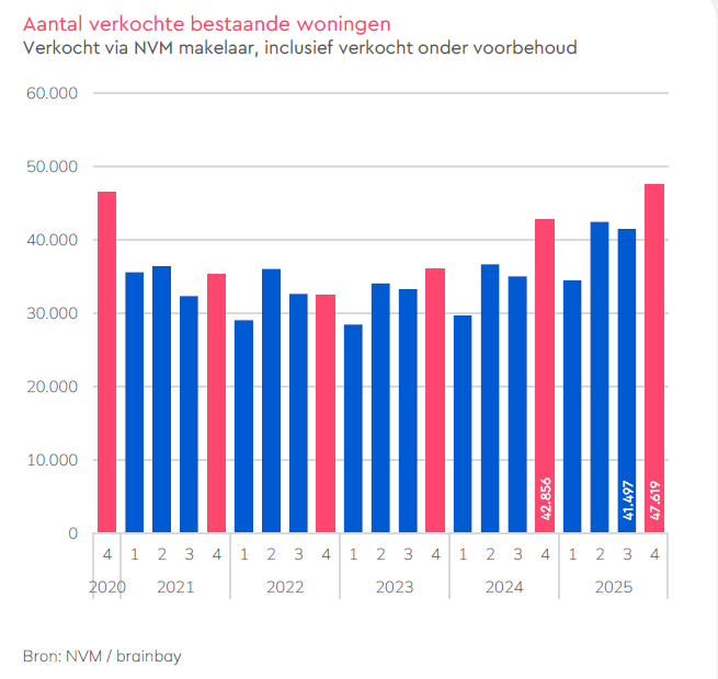 Bronnen: NVM Woningmarkt Q4 2025 (bestaande bouw & nieuwbouw) + NVM analyse woningmarkt Q4 2025.