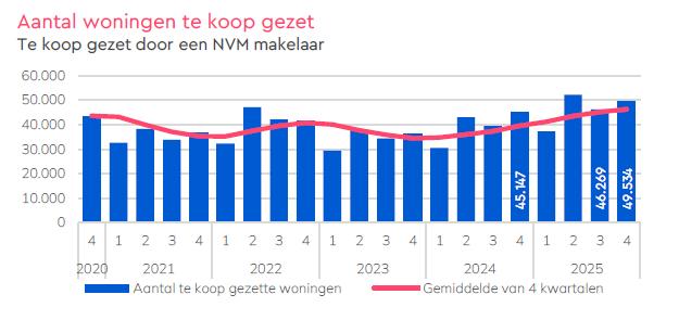 Nieuw aanbod: 49.534 woningen te koop gezet (een record voor een vierde kwartaal).